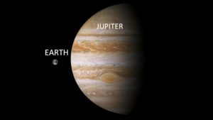 Size: Jupiter’s radius is about 71,500 Kilometers. It is really a huge planet. We can fill Jupiter with 1321 earths. See how small the Earth looks next to Jupiter!!
