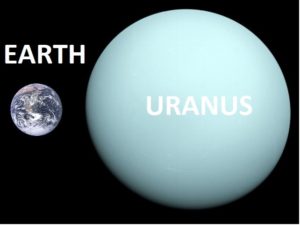 Uranus, an ice giant, is the seventh planet from the Sun, and it is the third largest in the solar system. Twenty-seven small moons and thirteen faint rings orbit this planet.
