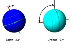What is unique about Uranus is its tilt. It has a tilt of 97° that makes its equator almost vertical to its orbital plane around the Sun as you can see in the picture below. The 97° tilt is possibly because of an impact with an earth-sized object long ago.