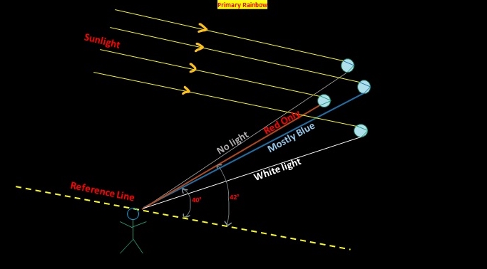 Another key point is, though the red color can emerge out of the raindrop anywhere between 0° and 42°, the intensity of red color is dominant at 42°. Similarly violet is dominant at 40°, though it can come out anywhere between 0° and 40°. Other colors are dominant in between these two colors. Thereby, this droplet creates a band of colors – violet at the 40°end and red at the 42° end – while other colors fall in between.
