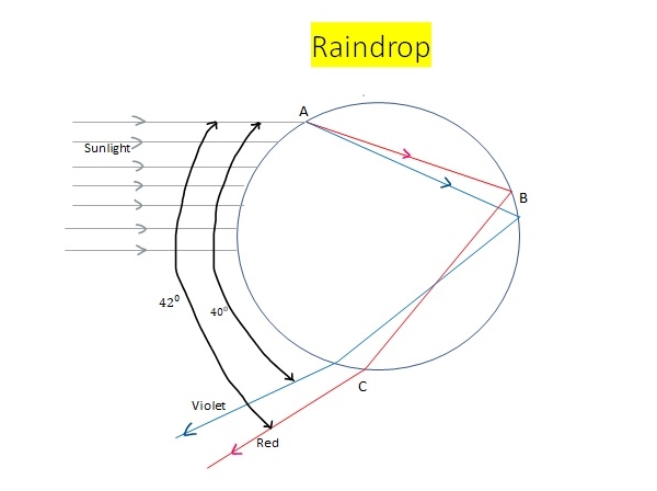 Let us consider a ray of sunlight that falls on a raindrop (at point A). A part of it refracts as it enters and separates into its component colors, as in a glass prism. Red light bends the least, as we have seen in the refraction section above, while violet bends the most. Other colors bend in between these two. All these rays travel to the other side (B) of the raindrop. At B, some of the rays reflect internally and travel to C where it refracts again to exit the raindrop; almost reversing its original direction.