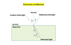 Pic. 2 shows a narrow beam of light (incident white light), travelling from left through air at an inclined angle, which encounters a flat glass surface. The line that is vertical to the surface is called ‘normal’. Part of the incident light is reflected by the surface forming a beam directed upward inclined to the right. Please note that the angle between the normal and the reflected beam (angle of reflection) is equal to the angle between normal and the incident beam (angle of incident). Both are θ1. This is the law of reflection.