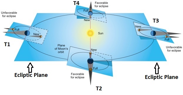 At T2 and T4, solar and lunar eclipses can occur only at points where the orbit of the Moon intersects the ecliptic plane either while ascending or descending. The points that intersect the ecliptic plane are called nodes. So, eclipses occur only at the nodes when the Moon’s orbit intersects the Earth’s orbital plane. For the same reason, we call the Earth’s orbital plane ecliptic.